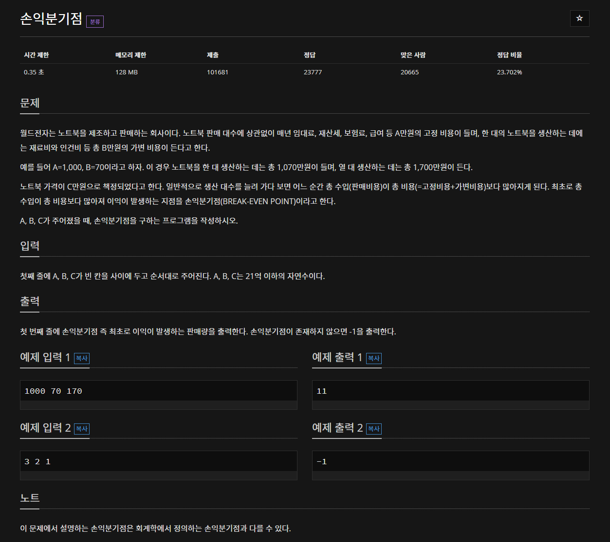 b >= c 일 때, 즉 손익분기점이 없을 때는 -1을 출력한다.