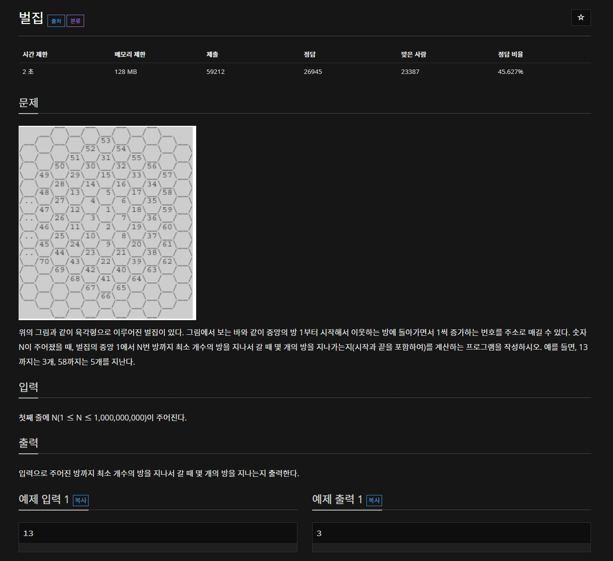 2~7까지 6개의 수는 1번, 8~19까지 12개의 수는 2번, 20~37까지 18개의 수는 3번... 이런 식으로 등차 수열을 이룬다.