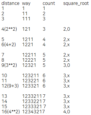 거리가 제곱근을 내림한 것의 제곱과 제곱근의 합보다 작은 경우는 제곱근*2를 출력한다.